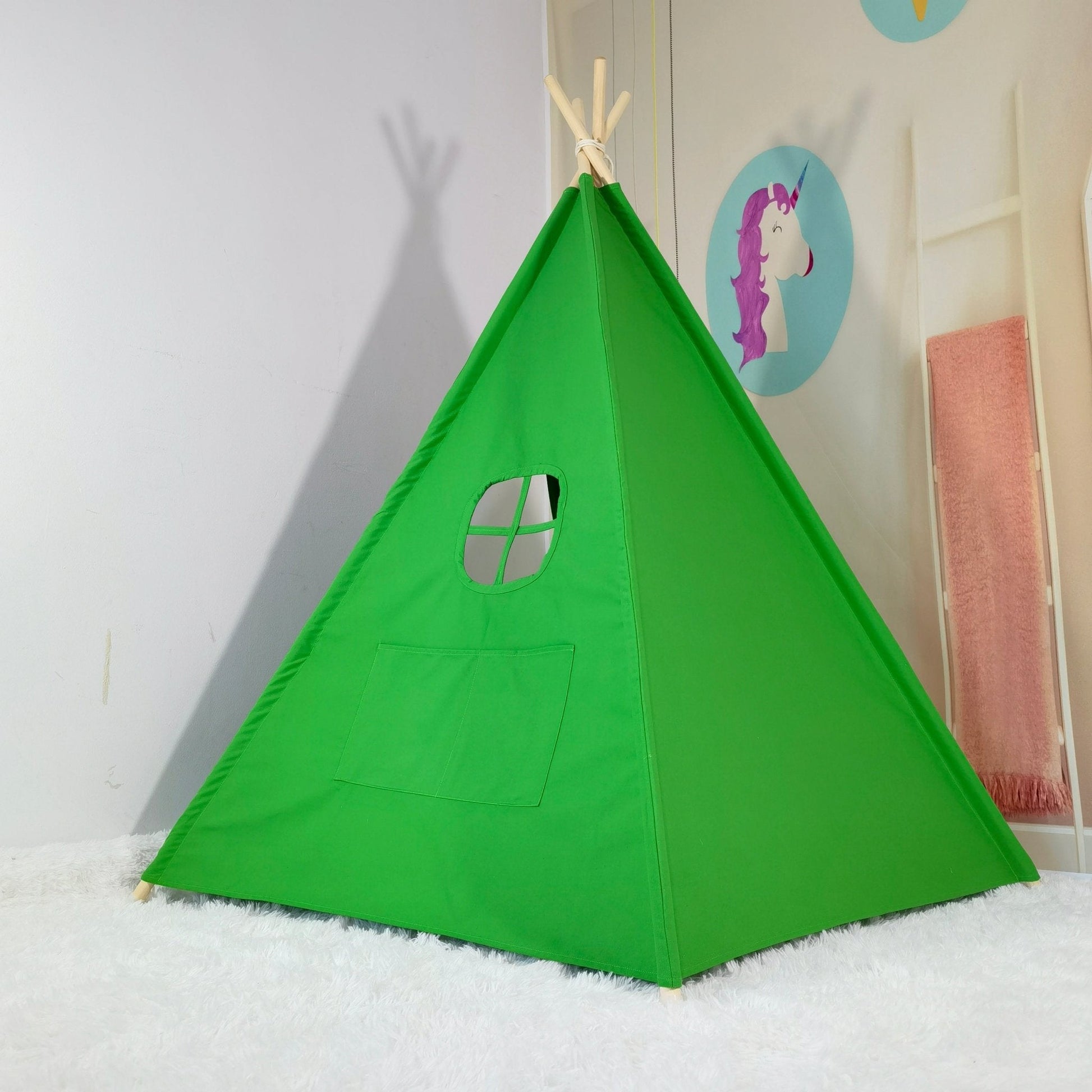 - Each festive bright green play tent features a premium 100% Cotton canvas cover with teepee window for your child to look out into the world around them or imagine new and far away places. Additionally, each kids teepee canvas cover is made with 2 spacious pockets under the window for storing those most precious toys to your child, be it his or her favorite Halloween gifts like a book or stuffed animal. Our play house is perfect for indoor play for halloween decor, however is rugged enough to go for an outdoor Halloween night play adventure as well. We just don't recommend leaving it outside overnight.